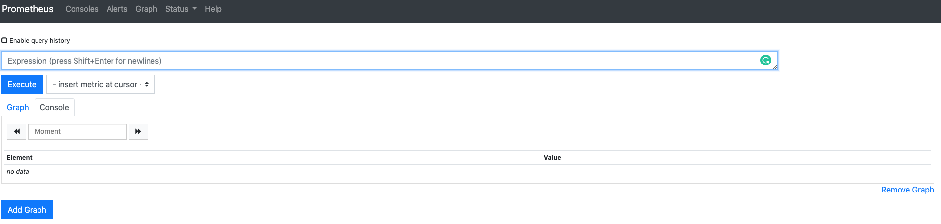 As I mentioned, the Alertmanager does have it’s own dedicated web-ui, and so does the Prometheus server. When you access the Prometheus web-ui (through a default port of 9090), you’re faced with a pretty simple, yet bland looking interface. It has a simple text input box labelled ‘Expression’, with a button below it that says ‘Execute’. Very exciting, let’s start playing.
