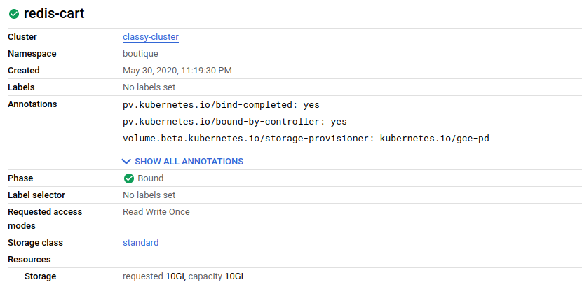 As you can see above, I have requested a persistent volume called ‘redis-cart’, using the storage class ‘standard’, which is the storage class installed by default in GKE for using Persistent Disks in GCE. The ‘ReadWriteOnce’ declaration just means that it can only be mounted as read-write by a single node. This is the default mode and will work for this scenario. I have requested 10gb of storage, which is also plenty for this example. As usual, the kubectl apply -f redis-cart-pvc.yaml command is enough to get it attached to the cluster. We can check that the volume was created by checking for the BOUND status upon calling kubectl get pvc.